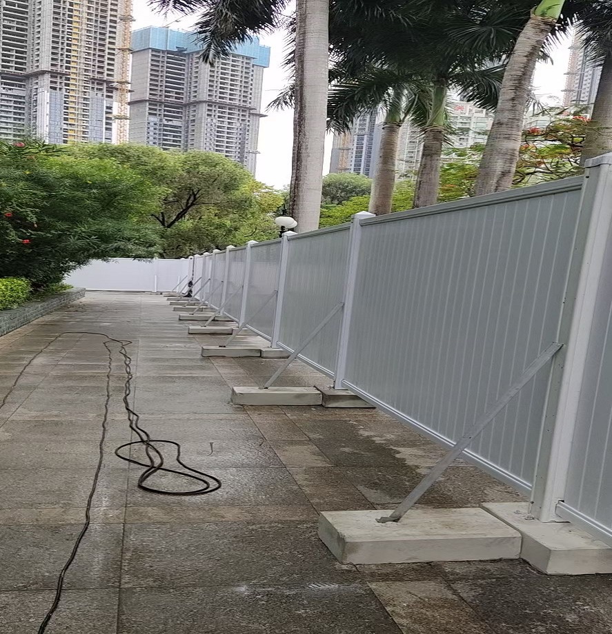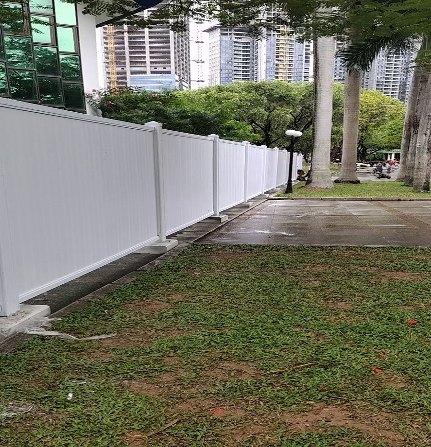 此工程所選用了深圳市旭東鋼構公司的PVC圍擋。深圳PVC圍擋為施工臨時圍擋,價格便宜,經濟實用,適用于工期比較短的工程,一般情況是半年(6個月)以下的工程。PVC圍擋的材料屬于阻燃不易燃燒的,相比以前的彩鋼夾芯板圍擋更為牢固美觀,PVC圍擋的立柱、橫梁內部都有方通鋼管內襯以增加圍擋的強度,該圍擋的面板是由10(28.5mm)內部鏤空的純PVC板拼裝而成,其節約庫存空間,運輸方便,安裝簡單,是短期工程,臨時施工工地的首選。