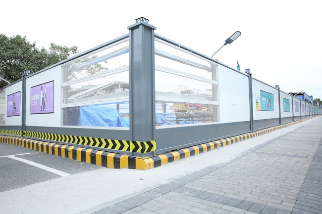 工地圍擋由磚砌圍擋基座、圍擋立柱(含套管)、上下橫梁、圍擋墻板組成,基座為1m*0.6m*0.3m標準圍擋基礎塊,外貼文化石。鋼圍擋A款常規尺寸是6.3m*2.5m,鋼圍擋B款與C款常規尺寸是3m*2.4/2.5m,而PVC圍擋常規尺寸是:3m*1.8m/2m/2.2m/2.5m,圍擋墻板厚度通常是0.8mm/1.0mm/1.2mm/1.5mm、其它墻板厚度可定制化生產。